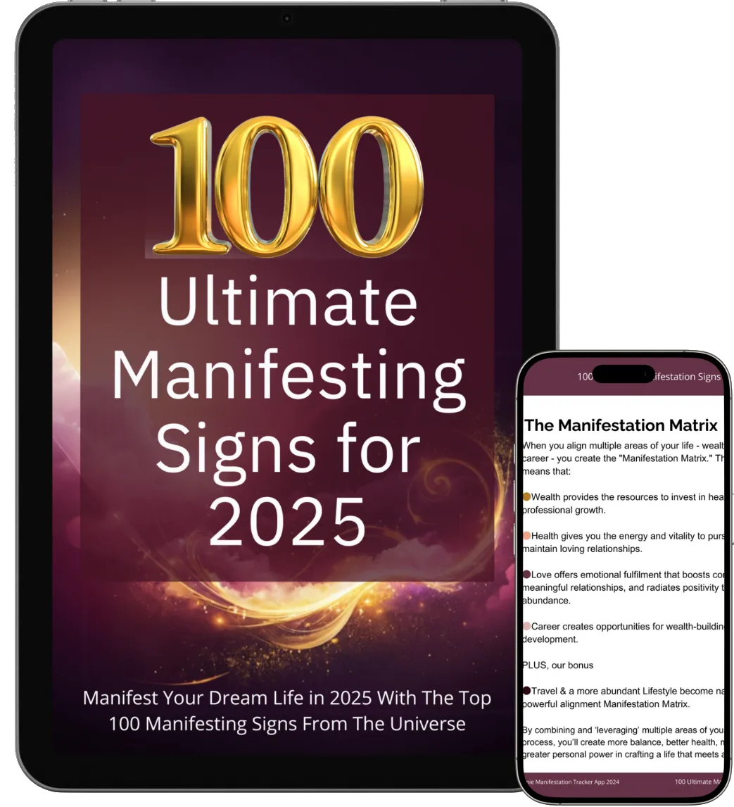 Unlock your journey to manifesting your dream life in 2025. Download your FREE 50-page bumper guide of the top 100 ultimate Manifestation Signs for 2025!